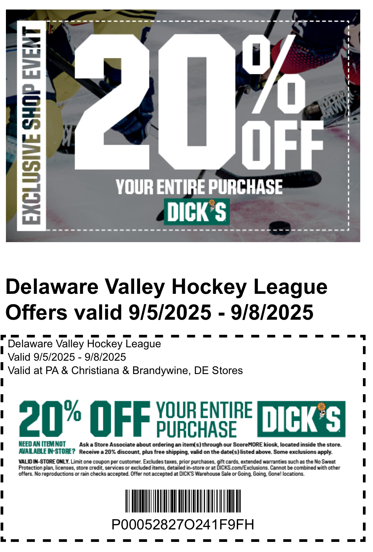Dick's Sporting Goods sponsors the DVHL and all Clubs playing in our League! Here is a special 20% off coupon good for Welcome Back Weekend.